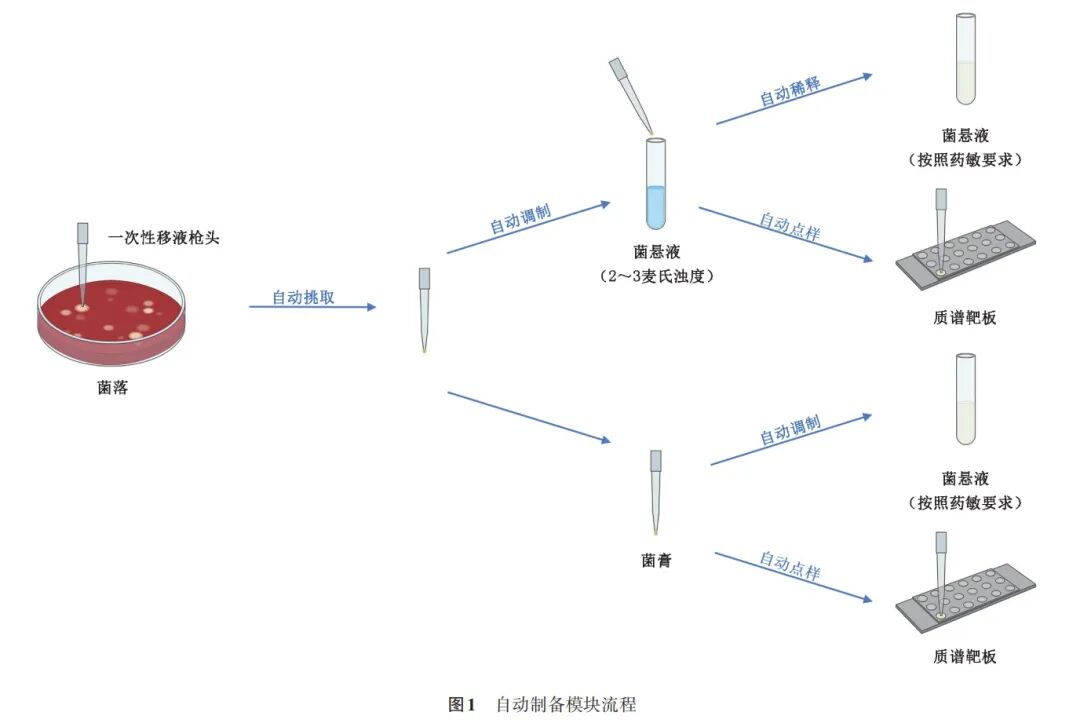 高濃度菌懸液常為2-3麥氏濁度單位,1μL點樣。當濁度不足時,可重復點樣操作。自動制備模塊避免了手工操作帶來的差錯,易于標準化。自動制備模塊需要匹配特定的靶板和質譜儀。