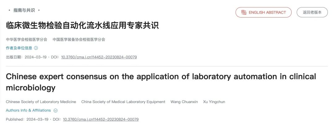 中華醫學會檢驗醫學分會, 中國醫學裝備協會檢驗醫學分會. 臨床微生物檢驗自動化流水線應用專家共識[J].中華檢驗醫學雜志,2024,47(3):224-233.