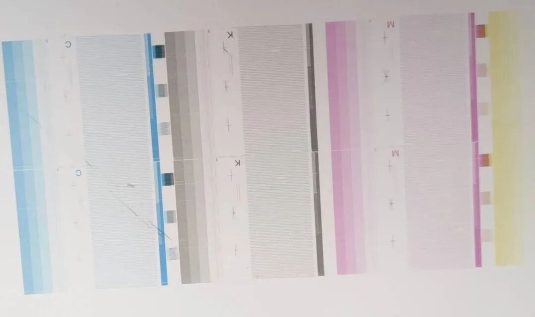 2、打印測試條,檢測噴頭狀態是不是完好,若不完好就繼續守護噴頭直至噴頭狀態完好(不缺針,不斜噴)。