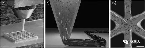 該實驗將約5wt%的納米粘土加入環氧樹脂中形成粘彈性流體。同期油墨中亦填充有磨碎的碳纖維(直徑和平均長度分別為0.65μm和12μm)和碳化硅晶須(直徑和平均長度分別為10μm和220μm),其可用于進一步改善印刷部件的機械性能。運用直徑為200μm~610μm的噴嘴制造擁有約200μm的壁厚和2mm高度(等于20層)的繁雜幾何結構。納米復合材料沿著印刷方向擺列,這些高縱橫比的纖維顯著影響復合材料的機械性能。圖3c展示出了印刷結構的光學圖像,從中可看出填料的整齊擺列。噴嘴內的剪切和拉伸流場被認為是填料取向的原由,這種印刷誘導的取向能夠加強機械性能。印刷的復合材料表現出高達約 24.5 GPa的楊氏模量,其接近木材,是最好的商場印刷聚合物復合材料的兩倍,并且比印刷的熱塑性復合材料楊氏模量高一個數量級。