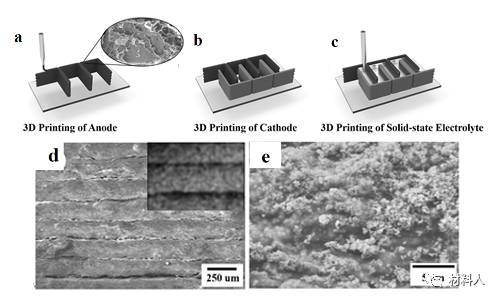 來自馬里蘭大學帕克分校的Liangbing Hu等人采用3D打印技術研制了一種新型微電池[5] ,其工作發布在Advance Material上。電池的負極為c (LTO)/GO復合材料,正極為LiFePO4 (LFP)/GO復合材料,電解質為 (PVDF-co-HFP) 和Al2O3納米顆粒的共混物。