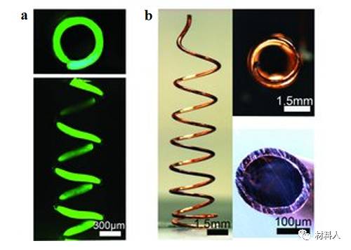 來自蒙特利爾綜恰當工學院的Daniel Therriault等人經過溶劑澆鑄直寫技術(SC-DW)制造了微流體通道和螺旋天線[4]。將聚合物溶液墨水細絲經過微噴嘴擠出,之后快速蒸發溶劑,制得微結構。在溶劑蒸發過程中,因為局部較高的聚合物濃度,長絲的直徑減小并且剛度隨時間逐步增多。這種剛性梯度使得能夠經過改變擠出噴嘴的移動路徑來產生自支撐彎曲形狀,在新擠出材料的低剛度區域中可出現細絲彎曲。在大部分溶劑蒸發之后,擠出長絲由流體狀態凝固,這有助于沉積的特征的形狀保持。