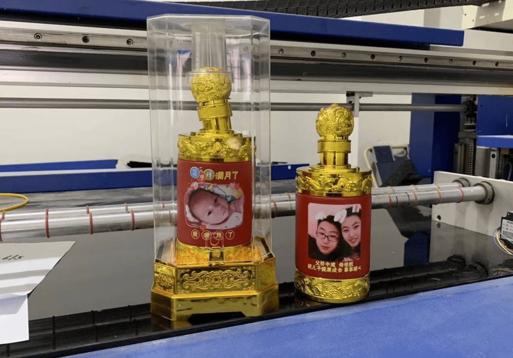 uv打印機 運用一種特殊的治具 能夠將酒瓶 玻璃瓶等圓柱體 旋轉打印 一邊旋轉一邊印刷 從而使普通的酒瓶更擁有表率性 可定制機構logo、婚慶照片等,擁有保藏 紀念價值。