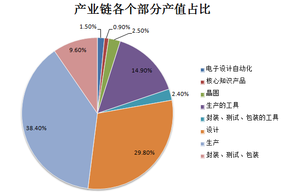 而產業鏈中高產值的部分是生產(38.4%)、設計(29.8%)、生產的工具(14.9%),這三個環節日前占據領先地位的均是美國。