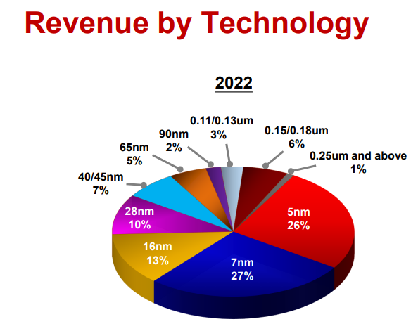 從制品收入形成來看,7nm占比27%,5nm占比26%,兩者合計占比53%;16nm占比13%,28nm占比10%。