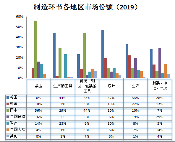 制造部分,美國在設計、生產的工具、生產三個環節的市場份額均排第1,分別達47%、44%、33%;日本在晶圓、封裝/測試/包裝的工具這兩個環節的市場份額最高,分別為56%、44%;中國在晶圓部分的市場份額合計為20%,封裝/測試/包裝的市場份額43%,生產的市場份額26%,設計的市場份額11%。