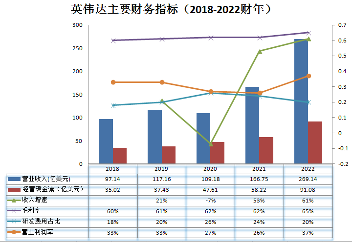 從2018-2022財年的財務指標來看,英偉達的收入增速在近期兩年達到了53%、61%,相當高;毛利率亦穩定在60%以上,運營利潤率亦提升至37%。開發費用占比保持在20%上下。