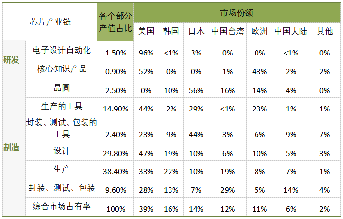 表:芯片產業鏈各部分產值與市場份額(2019年)