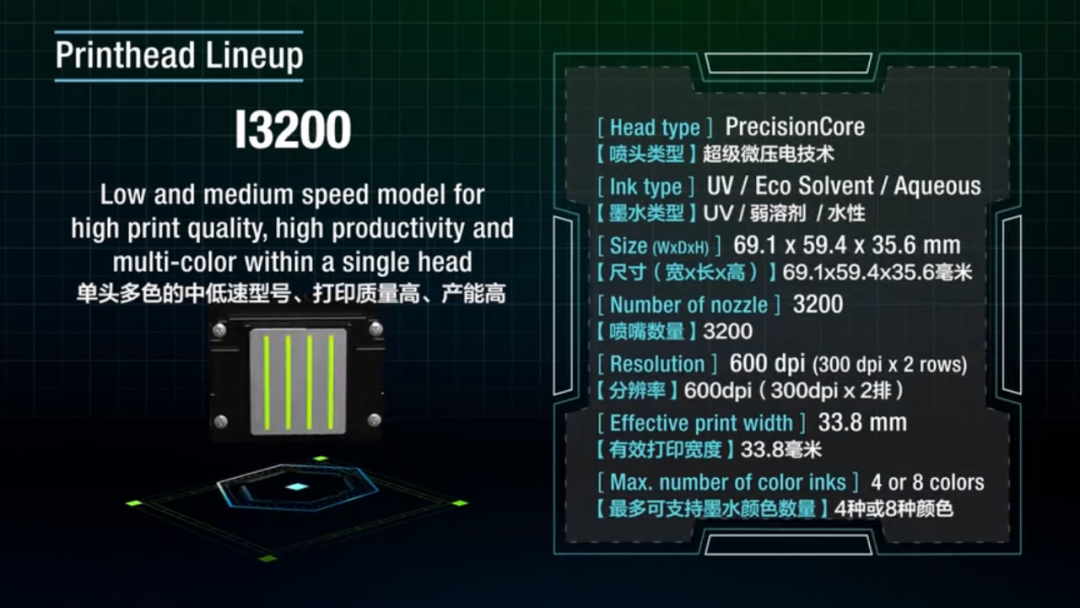 按照愛普生官方數據表示,I3200-U1(高粘版)具備愛普生4大核心優良,其中愛普生給出了8個字來形容這款噴頭的核心價值,這8個字是:“高分辨率,多色耐用”;600dpi/色,3200個噴孔,VSDT可變墨滴技術實現多灰度打印,經過愛普生實驗室老化測試,可保證超過1年的運用壽命,最高理論值超過2年,而價格僅僅僅有8000元人民幣,針對運用者來講,此等高性價比之作,的確是首選之物。