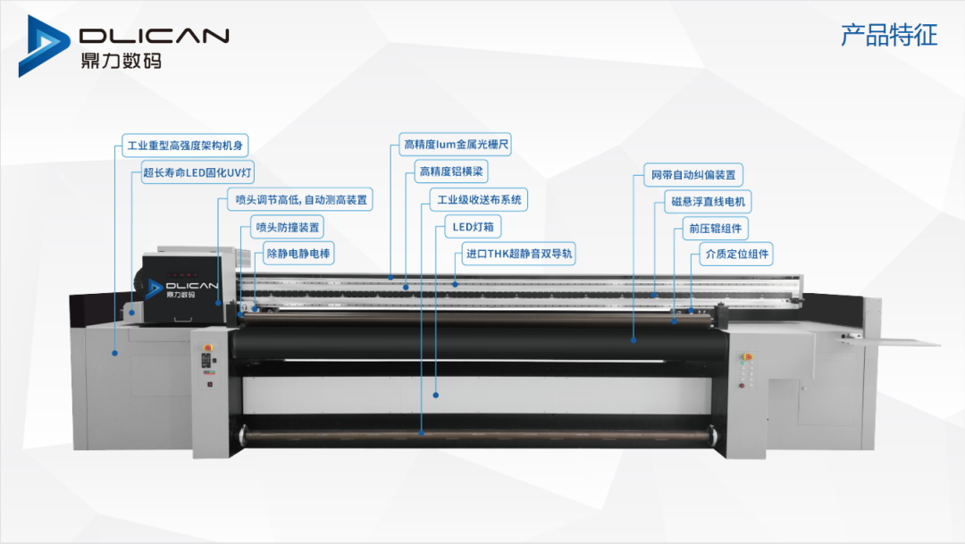 全新款 DLI-2513 UV平板打印機全新外觀設(shè)計,設(shè)備外觀更簡約大氣更具科技感